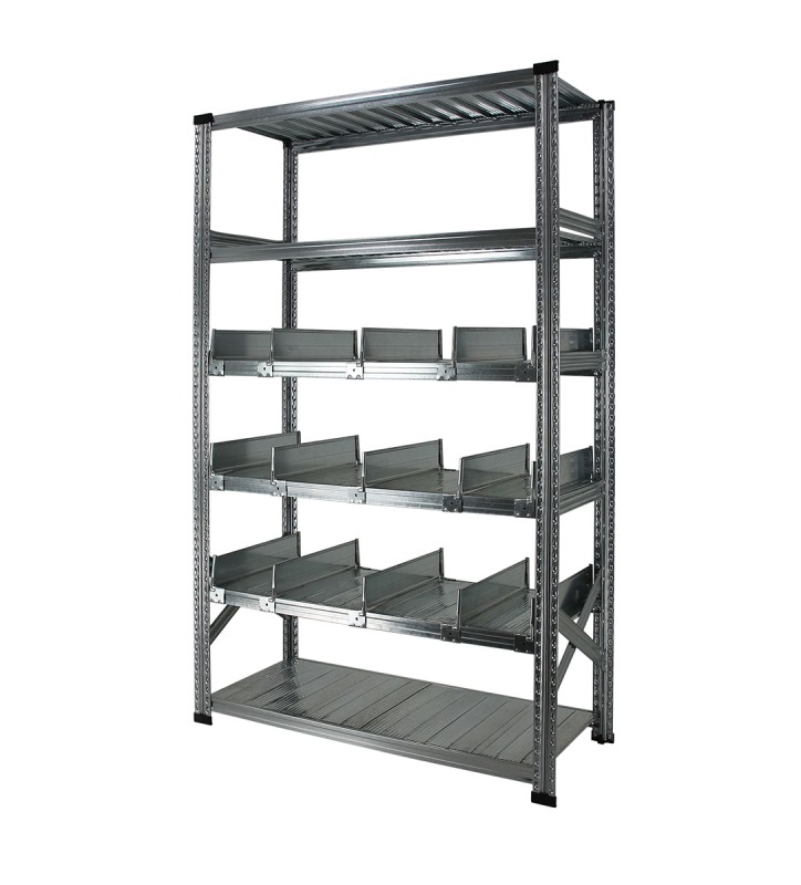 • Indeling van de rekken : zie foto. Keuze uit rechte vakken, trapezium vakken en verschuifbare tussenschotten.