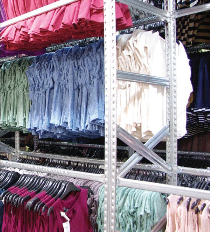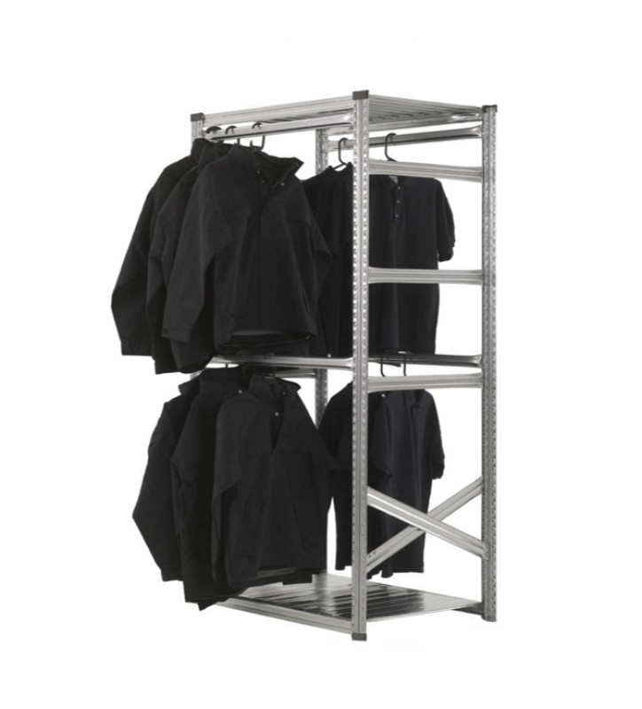 Aanbouwrek Dubbel ophanging. 2 niveaus confectiestangen, 3 niveaus legborden